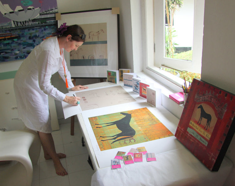 This image of horses standing with stylized trees takes on a vintage feel. Using a color palette of Teal, Cocoa and French Beige. Clare's quirky painting of horses is drawn in an emotive inky line created by mono-printing.